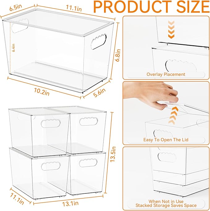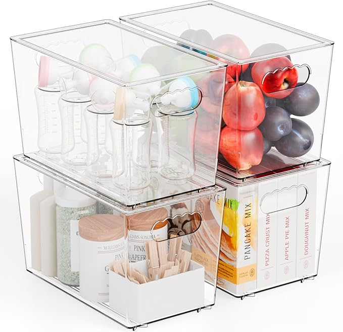 Yieach 4 Pack Stackable Clear Organizer Bins With Lids & Handle,11.1″ Deep Plastic Hall Closet Storage Bins for Pantry,Refrigerator and Cabinets,Acrylic Container for Organizing Toy,Snacks Organizer