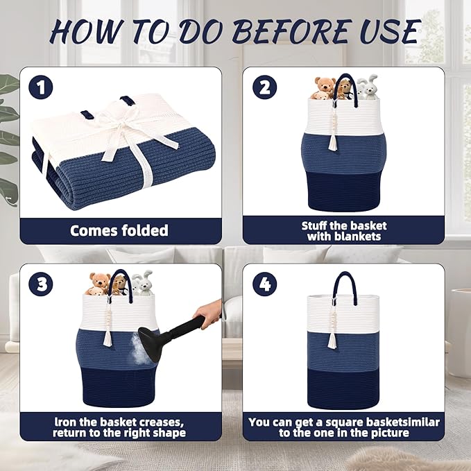 - š[WELL-STRUCTURED & EASY RE-SHAPING]: Heavy duty flexible rope cotton basket was made really strong and it's very durable, tall woven basket can also maintain its shape after use. To recover to it's original shape, fold-able basket is better to fill with some items, like blankets and then steam it with an iron.