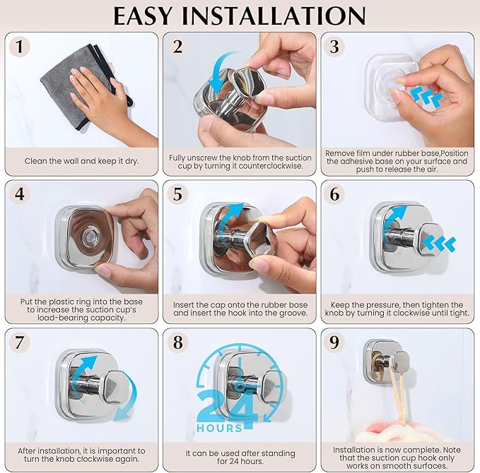 - 1:Shower Suction Hooks - No Drill Install Quick-install suction shower hooks for shower walls/glass. Bathroom hooks function as no drill towel hooks for bathroom, securely hanging towels & robes. Avoid: CERAMIC, POROUS MARBLE, PAINTED WALL, FROSTED GLASS, WALL PAPER, MOSAIC, GRANITE! Ideal bathroom hooks for shower areas.