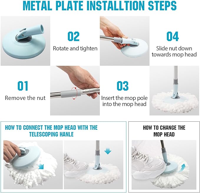 - 【Wide Application】The spinning mop and bucket is wet or dry usage, 360° microfiber spinning mop head easily reaches any difficult corners and gaps without feeling the scrape, with excellent absorption capacity, deep-cleaning microfiber removes and absorbs tough dirt, dust, pet hair, grime, perfect for all types of surfaces, like laminate, hardwood, ceramic, tiles, glass, etc. Microfiber Mop Head is machine-washable and reusable.