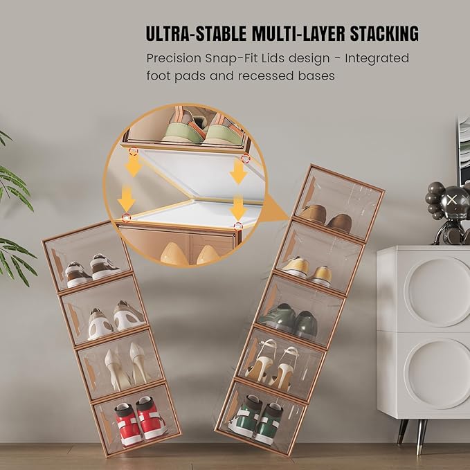 - 【Clear & Thicken Shoe Boxes】: Crafted from reinforced PP+PC transparent plastic, these sturdy shoe boxes resist cracking, warping, and crushing. Featuring 6-Panel hard plastic versus thin PP-only boxes, they support heavier loads without deformation for extended longevity. The eco-friendly transparent design ensures crystal-clear visibility while protecting against dust and moisture.