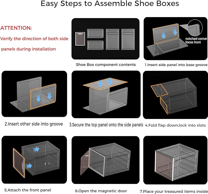 - 【Easy Assembly & Magnetic Door】: Featuring modular snap-fit design locks securely into preset grooves with a click, our shoe boxes assemble effortlessly without tools using installation instructions. Stack freely with magnetic side doors and recessed handles for one-handed access. High-clarity panels provide instant visibility—ideal for displaying special collection shoes, organizing and retrieving shoes in a closet.