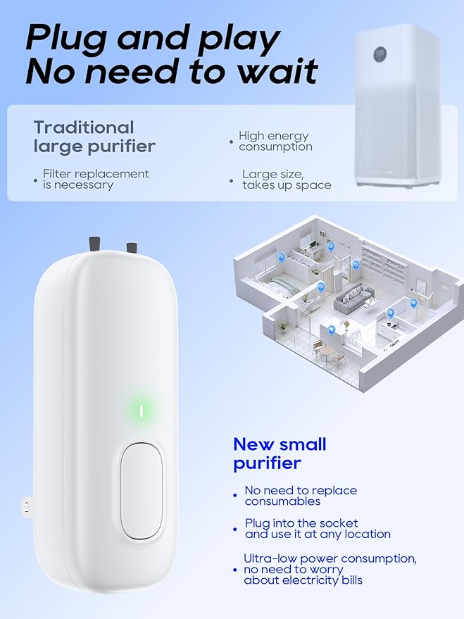 - Sleek & Practical Design: Boasting a minimalist and stylish look, this plug-in wall air ionizer is both unobtrusive and highly effective. Its small, lightweight, and compact build makes it portable for on-the go use; just plug it in and start enjoying cleaner air—no complicated setup. It’s the perfect space-saving alternative to bulky, pricey traditional air purifiers.