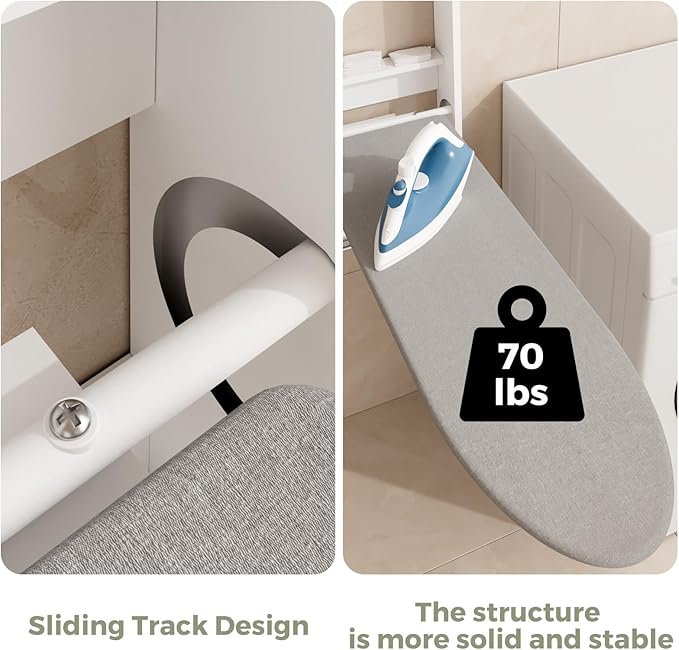 - Space Saving Design: This wall mounted ironing board cabinet features a foldable board that stores neatly inside the cabinet. The track design makes it sturdier than standard folding boards and it can support up to 70 lbs for reliable daily use
