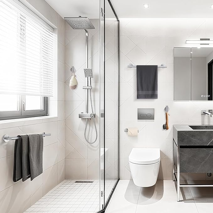 - 【Material】-The bathroom towel bar set constructed from SUS304(18/8) stainless steel which prevents rust and corrosion in your bathroom for long lasting durability.