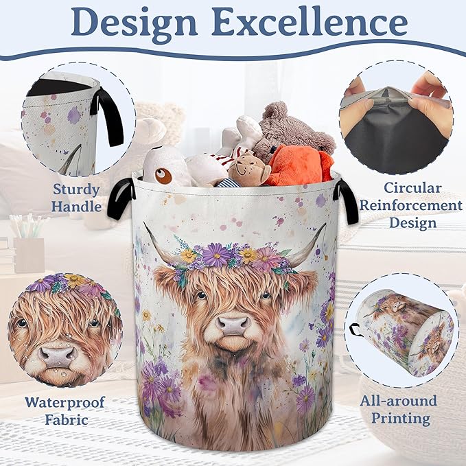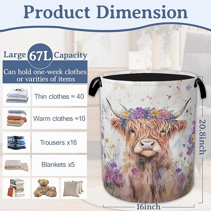 - Foldable Freestanding Design:The Highland Cow Flower Fun laundry basket folds flat for compact storage when not in use, saving space. When in use, it stands upright and holds its shape without collapsing, making it easy to toss clothes in or take them out.