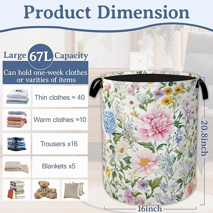 - Foldable Freestanding Design:The Watercolor Floral Wildflowers laundry basket folds flat for compact storage when not in use, saving space. When in use, it stands upright and holds its shape without collapsing, making it easy to toss clothes in or take them out.
