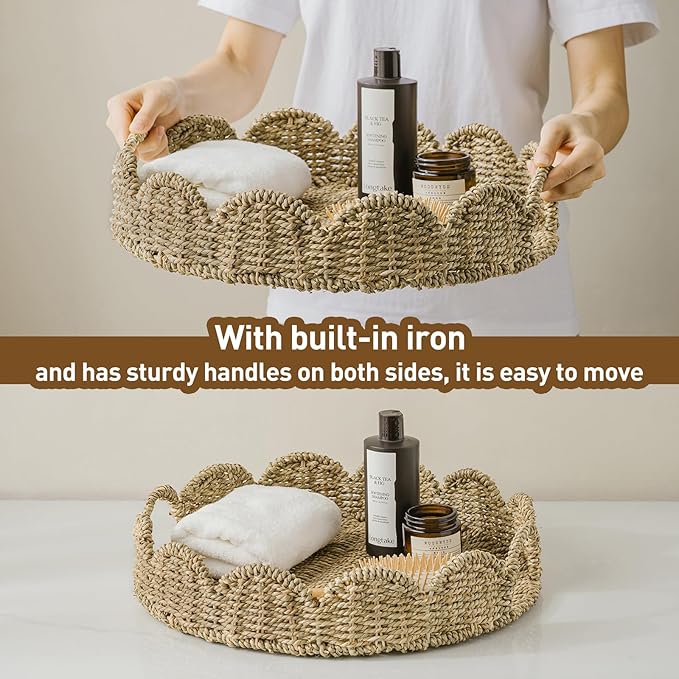 - 【 High quality natural materials 】: The scalloped round tray is hand woven by skilled craftsmen using seagrass on a sturdy iron frame. Each woven basket frame is reinforced with a sturdy iron frame, ensuring durability while maintaining a lightweight texture.