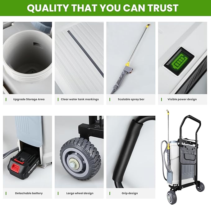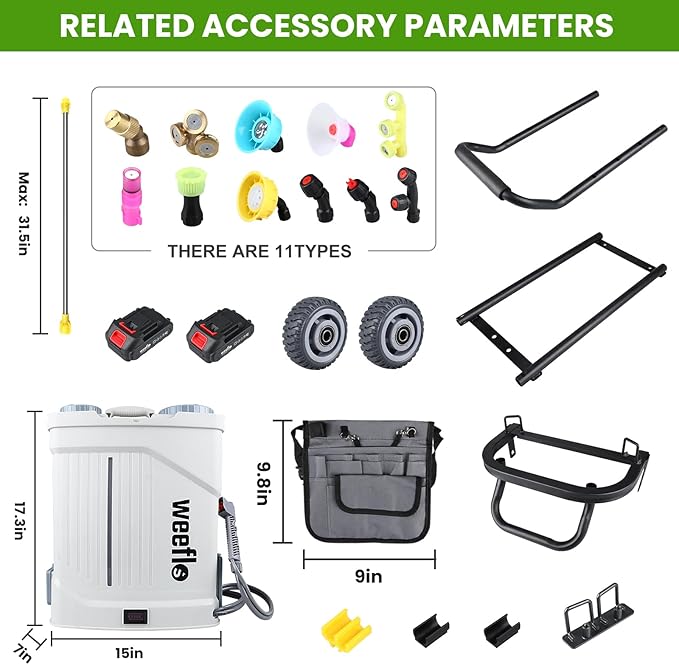 - BATTERY POWERED ELECTRIC GARDEN SPRAYER: As a battery powered sprayer and electric sprayer, the Weeflos tow-behind garden sprayer runs on two detachable 21V lithium‑ion batteries. Each battery supports 8–12 gallons. Adjustable up to 100 psi and a 4.2‑gallon tank help you finish daily yard work faster with less effort.