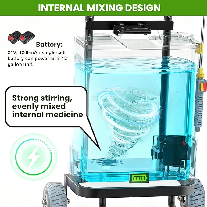 - PRO FEATURES: : One‑touch automatic mixing; large, filtered fill port for easy water/additive loading; transparent water‑level indicator; includes a tool bag. Delivers consistent output without the repeated pumping of a manual pump sprayer.