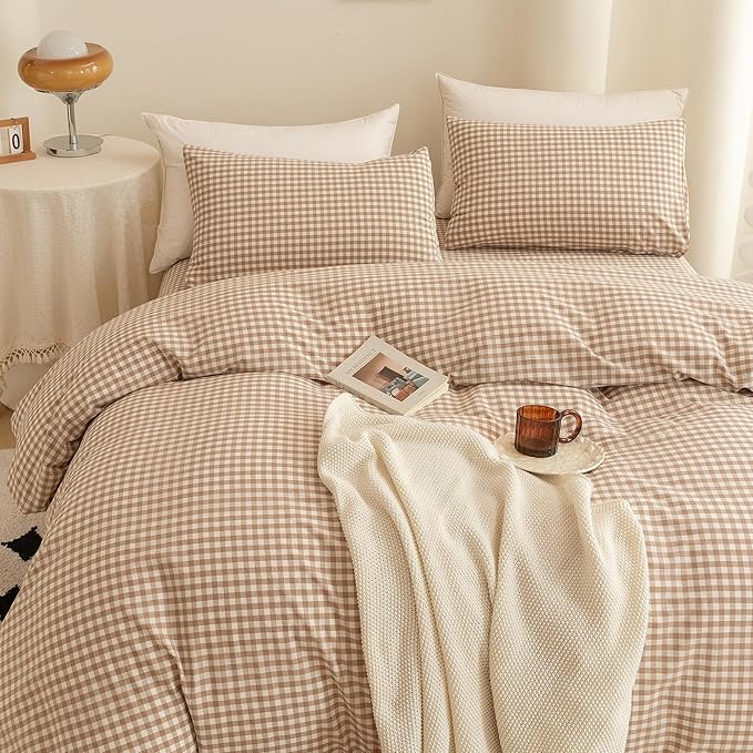 ECOCOTT Gingham Duvet Cover Queen Size 100% Washed Cotton Like Linen Feel Super Soft & Comfy Bedding Set Modern Checkered Design for All Seasons
