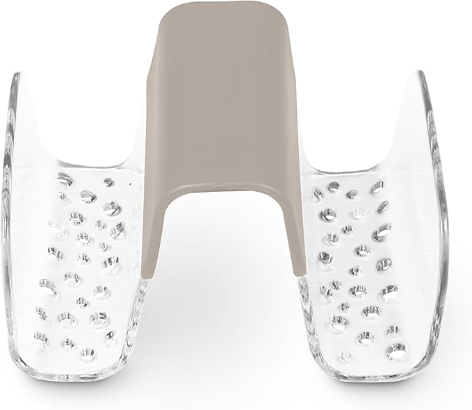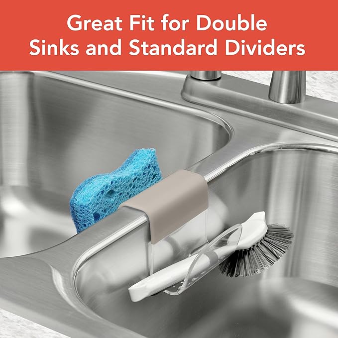 Spectrum Sink Saddle for Kitchen Sink Warm Gray Clear Sponge and Brush Holder Organizer, Dish Brush and Sponges Plastic Saddle Caddy for Double Sink Storage with Drain Holes for Quick Drying