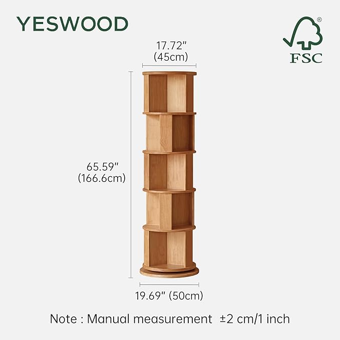 YESWOOD Solid Wood Rotating Bookshelf, 5 Tier Round Revolving Bookcase, 360° Spinning Shelf Tower, Floor Standing Bookcase Storage Rack for Home Office, Corner, Bedroom, Study, Living Room